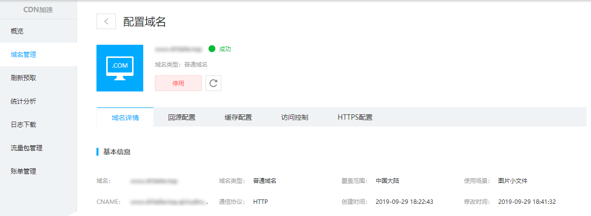 进入域名管理界面,可以查阅包括加速域名、CNAME、创建时间、修改时间、域名状态、域名类型、协议、使用场景、覆盖信息等基本信息。