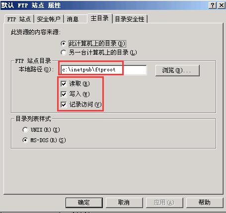 鼠标右击“默认FTP站点”,选择属性,可以看到初始设置,比较重要的为主目录,如下图:
