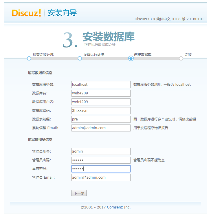 4.进入数据库填写页面。 数据库信息分别输入:数据库地址(网站数据库同一个服务器,可以使用localhost),数据库用户,数据库密码,数据库名称。 此处的管理员账户就是后台账户(非常重要)。