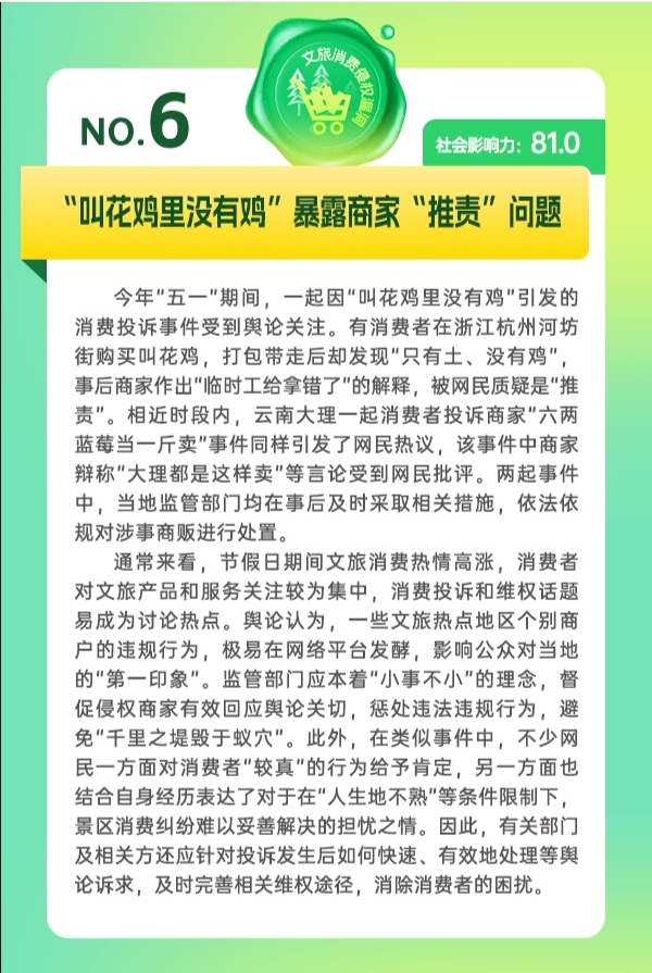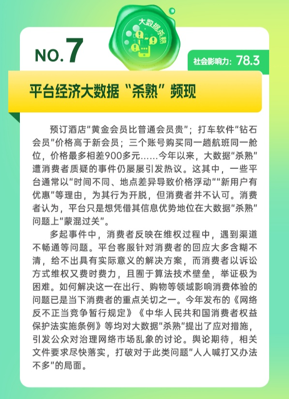 中国消费者协会、人民网舆情数据中心、中国消费者杂志社共同梳理发现,现制饮品品牌屡现过期食材等问题;“职业闭店人”成为预付式消费维权阻碍;微短剧付费乱象、内容违规问题频发;网络平台自动续费“开通容易退订难”;演唱会“柱子票”影响消费者现场体验;“叫花鸡里没有鸡”暴露商家“推责”问题;平台经济大数据“杀熟”频现;消费者购车遇 4S 店“价外加价”;租赁市场“提灯定损”类乱象困扰消费者;“被直播”为商家引流遭消费者投诉等案例涉及的消费维权问题较为突出。